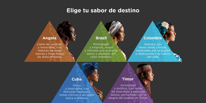 Un verdadero viaje alrededor del mundo, a través de los 5 blends disponibles de tu café favorito: Angola, Brasil, Colombia, Cuba y Timor.